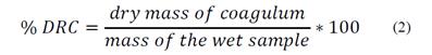 For determining DRC, a co-precipitation of some constituents which did not include the rubber was made during the latex acid coagulation. DRC was calculated by eq. (2):