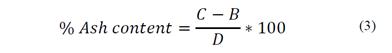 where: D is the sample mass, B is the empty crucible, and C is the crucible plus the ash mass.