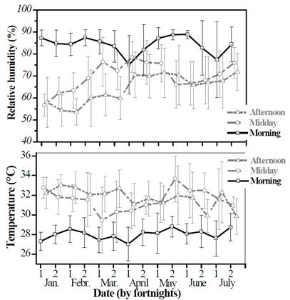 Figure 1: Temperature and relative humidity at plantation where NR lattices were collected. Average and standard deviation are plotted. Data were horizontally shifted in order to facilitate the visualization of results.