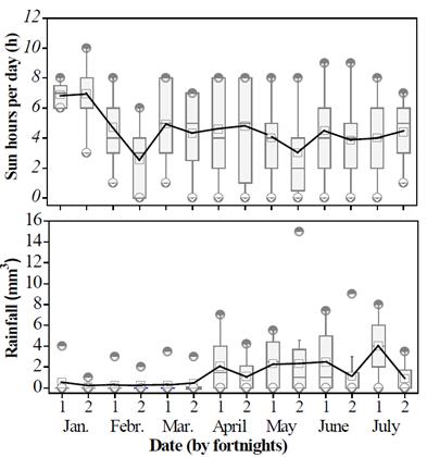 Figure 2: Boxplot of rainfall and sun hours per day at plantation were NR lattices were collected. Lines connecting the average values are showed to facilitate the visualization.