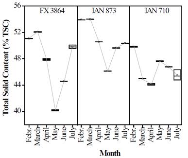 The highest TSC and DRC occur in February-March period and the lowest values occur in May for IAN 873 and FX 3864 clones. For IAN 710 clone, the highest TSC and DRC occur only in February and the lowest values occur in April. Lower values of the percentage of DRC and TSC generally match the few sun hours, high rainfall and relative humidity at midday and afternoon. This agrees with the description in several studies of Moreno et al. [4, 6]. DRC and TSC values are related to a decrease in the biosynthesis of the rubber tree between January and February when the foliation and flowering senescence begin. It is significant to notice that DRC and TSC for the three clonal varieties studied in this work are above the average values that are reported in literature [4-8].