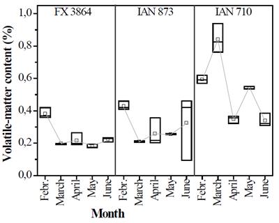In Fig. 5, the variation of volatile-matter content is shown. Volatile-matter in NR latex is related to high amounts of moisture, as well as contamination with volatile substances during coagulation of rubber sheets. Volatile-matter content for most of the samples was less than the 0.8%, which is the maximum percentage allowed by ASTM D 2227; just in March the values were higher than the limit for IAN 710 clone. The variance in some samples of a same clone at the same collection time is due to the lack of greater control over the collection and processing of rubber carried out by farmers during tapping.