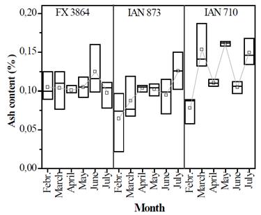 Fig. 6 shows the variation of ash content. Ashes in NR latex are related to nonvolatile mineral fraction, including minerals inherent in the rubbery substance such as Ca and Mg [4,6]. Ash content of all the samples was below 0.60%, the maximum specified in ASTM D2227 standard [9]. ANOVA and Tukey tests indicated that no significant differences were observed among clones, or over the period of the study. N, P, K, Na, Cl and S are mobile in Heveas, while Zn, Cu, Mn, Fe, and Mg are partially mobile. When nutrients are absorbed by a process of constant reutilization, as occurs during leaf senescence, ash content tends to decrease, as observed in February for IAN 873 and IAN 710 [4,6].