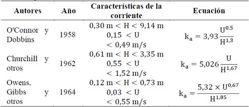 Tabla 3: Fórmulas para el cálculo de la constante de reaireación