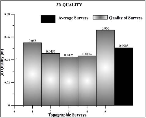 In Fig. 7, the different surveys are shown on the abscissa axis and the ordinate axis shows the quality in position and height at which the points of all topographic surveys were sampled.