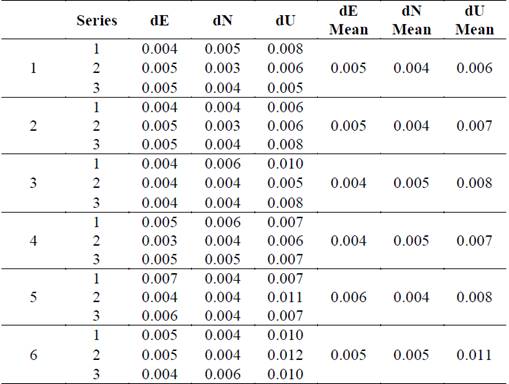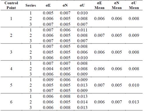 Table 3 shows the control points, the horizontal and vertical components, the accuracy of each component in the three series of measurements taken and the average value for each component.