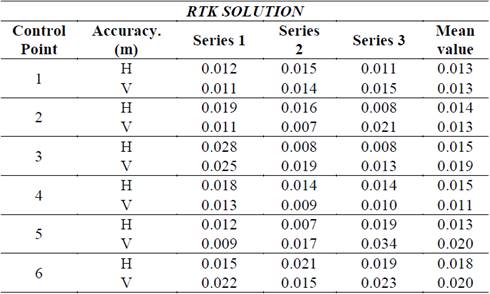 If we compare the static method used to obtain the coordinates assigned to the control points, with sampling in (RTK), the accuracy reached in determining said coordinates is high, even though it would probably have been necessary to take a larger number of measurements. The average accuracy values for the six control points, in the horizontal and vertical components are: (0.015 - 0.016) m, respectively. Position (3D) 0.022 m.