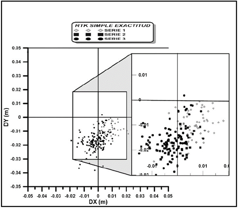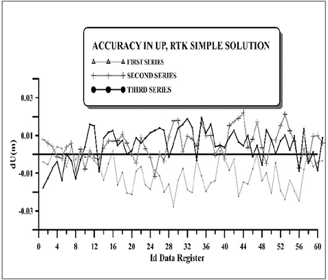 To check the deviation of the coordinates obtained by the receiver three series of measurements are taken at different times, taking 60 data in each series. The solution used is that generated by the RAP applying the MAC concept, differential corrections from the nearest station, transmitted in RTCM 2.3 MESSAGES format, through NTRIP [3,4]. The coordinates obtained in real time RTK compared to the coordinates of the control points obtained with the upper range static precision method will allow for the standard deviation to be obtained and thus to establish the accuracy or veracity of the system.