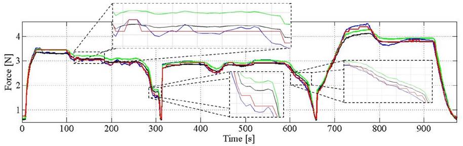 Figure 8: Force estimation through different methods: (red) CMA using a sensor-tuned Preisach density function and