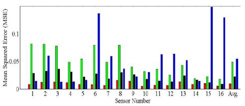 Figure 9: Error bar plot depicting the force MSE for the sixteen A201-1 sensors operating on the following estimation methods: (red) CMA using a sensor-tuned Preisach density function and