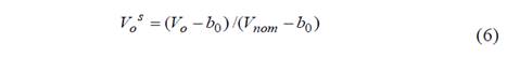 Obtaining μ(α,β) and η0 is not a straightforward procedure; specialized hardware is required and a time consuming characterization must be performed followed by non-trivial programing. Fortunately, it is possible to simplify the characterization process if the parametrization is performed as follows: Given b0 , the output voltage of a FSR at null force, and Vnom , the maximum output voltage at the nominal sensor range; then, the following linear transformation can be applied to any Vo reading during both: the estimation of μ(α,β) and η0 , and later, during sensor operation.