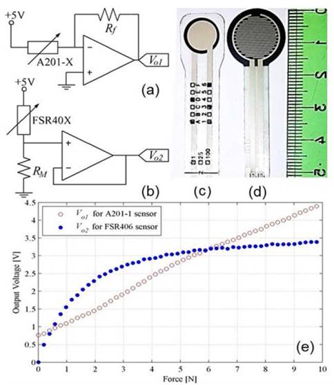 Figure 1: Driving circuits for: (a) FlexiForce A201-X, (b) Interlink FSR40X. Pictures of: (c) A201-1 and (d) FSR402 next to a ruler in centimeters. (e) Typical sensors’ response: A201-1 (circle red) and FSR406 (solid blue).