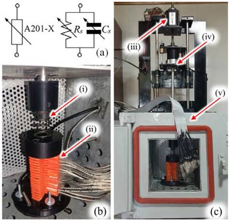 Figure 2: Equivalent model and test bench for characterization of A201-X sensors. (a) Black box model and equivalent circuit for an A201-X FSR. (b) Zoom-in picture depicting the spring (i) for mechanical compliance of the test bench and the bunch of sixteen A201-1 sensors (ii) arranged in a sandwich configuration. (c) Picture of the test bench showing the stepper motor (iii), the LCHD-5 load cell (iv) and the temperature chamber (v).
