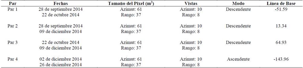 Donde I i,k es la amplitud compleja del k-ésimo pixel en la imagen i, i = 1, 2. Para determinar y cuantificar el retroceso glaciar del VNR, VNSI y VNT, se utilizaron imágenes de Satélite Rapideye e imágenes Landsat 8 OLI TIRS. Para la generación de interferogramas e imágenes de coherencia se utilizaron imágenes en modo complejo del satélite canadiense RADARSAT II. En la Tabla 2 se presentan las características de las imágenes ópticas utilizadas en este estudio y en la Tabla 3 se presentan las características de las imágenes RADARSAT II.