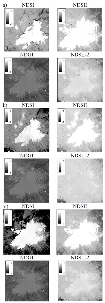 Figura 3: Cálculo de índices espectrales (Tabla 1) para el Volcán Nevado del Ruiz, a). 29 de marzo 2014. b). 26 de diciembre 2014. c). 24 de septiembre 2015.