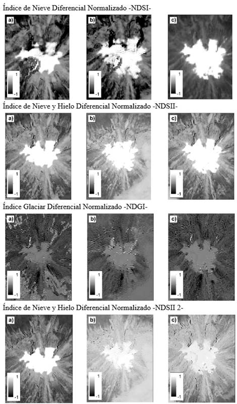 La utilización de Índices de Nieve Diferencial Normalizado -NDSI- es una herramienta adecuada que permite la delimitación de superficie glaciar. Sin embargo, en zonas de nieve cubiertas de ceniza, es importante acompañar esta técnica con procesos de digitalización manual para el re identificación de nieve o hielo en un objeto de estudio, basados en otros criterios como visitas a campo o fotos y videos de sobrevuelos.