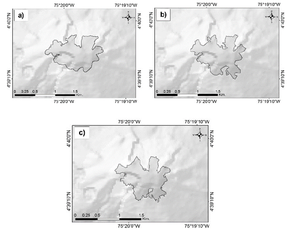 Al calcular los IE la presencia de ceniza en el VNR dificultó la identificación de valores por encima del 0,4 [11] para poder establecer la presencia de nieve o hielo en el casquete glaciar. Por esta razón, los vectores resultantes se ajustaron mediante métodos de digitalización manual en aquellas zonas en donde se confirmó que la ceniza recubría el área glaciar en la zona de estudio a partir de fotos y videos obtenidos en sobrevuelos disponibles (http://www2.sgc.gov.co/Manizales/Volcanes/Nevado-del-ruiz/Galeria-de-fotos.aspx). También se efectuaron modificaciones a valores de pixel catalogados con tipos de cobertura diferentes al verdadero; para ello, se eliminaron polígonos pequeños con un tipo de valor de pixel indefinido. La Fig. 4 muestra los resultados de la delimitación del área glaciar del VNR.