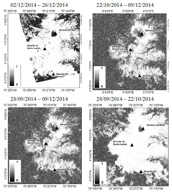 De acuerdo a los resultados, los tres nevados han presentado una disminución importante de la superficie glaciar en un período de cinco años. Entre el 2010 al año 2015, el VNR ha presentado un descenso de 24%, el VNSI un 60%, y el VNT un 42%. Con respecto a la técnica de InSAR, en la Fig. 10, se puede evidenciar que el área en estudio, para los cuatro interferogramas generados poseen una coherencia muy baja en tonos obscuros; principalmente en las zonas cubiertas de nieve y vegetación;