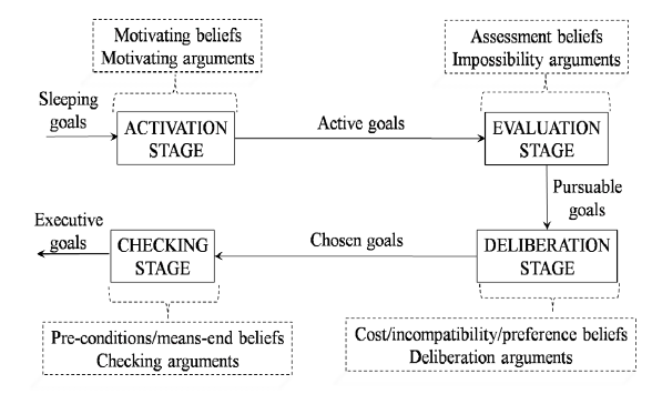 Deliberation stage acts as a filter on the basis of incompatibilities and preferences among pursuable goals. Goals that pass this stage are called chosen goals. This stage is based on the following beliefs: