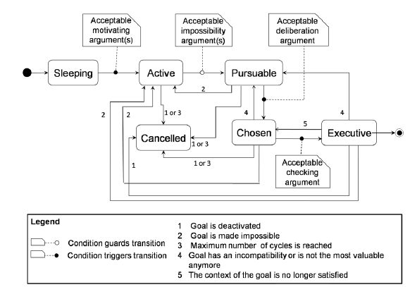 To the best of our knowledge, this extended model has not been formalized yet. Therefore, the aim of this work is to propose an argument-based computational formalization, where arguments act as filters between one stage and another and guide the transition of goals. Four types of arguments are defined; each one is associated with each stage of the goal processing cycle. On the one hand, arguments in activation, deliberation and checking stage act as supports for a goal to pass to the next stage; thus, if there is at least one acceptable supporting argument for a given goal, it will become active, chosen or executive, respectively. On the other hand, arguments in the evaluation stage act as attacks, preventing a goal from passing to the next stage. Thus, if there is at least one acceptable attacking argument for a given goal, it will not turn out to be pursuable. Fig. 1 shows a general schema of the goal processing stages and the status of goals after passing each stage, it also shows the necessary arguments that support or attack the pass of a goal to the next stage. For our approach, we also consider a status before the active one, it is called sleeping.