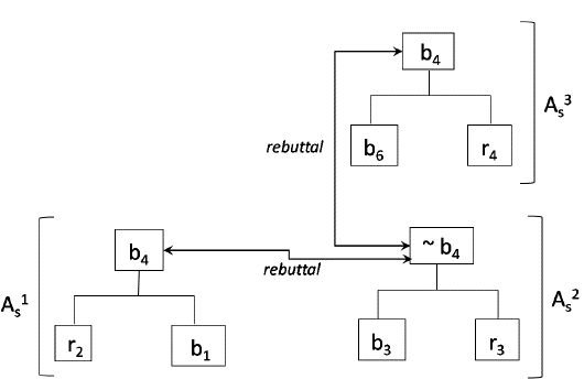 Since the quantity of standard arguments that support belief b4 are greater than the arguments that attack it, we can say that extension ε1 is the selected one to determine which arguments are acceptable, and therefore which goals become active. Nevertheless, notice before that since , a new motivating argument can be generated: