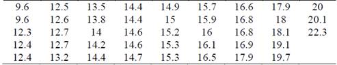 Similarly, by applying the proposed method to the Weibull distribution, we have from step 1, Sxy w =8.8996 (column 8). From step 2, Sxx, as in the lognormal case, is also Sxx=1.3412 (column 10). From step 3, and eq. (31), b 1w =6.6357. From step 4, Syy w =61.9775 (column 12). Therefore, from step 5, and eq. (32), R w 2 =0.9528.