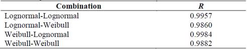 Finally, the stress-strength analysis for the four possible combinations between the Weibull and lognormal distributions, is presented in Table 3. The estimation of the stress-strength reliability was performed by using the eq. (40-43) given in section 7.