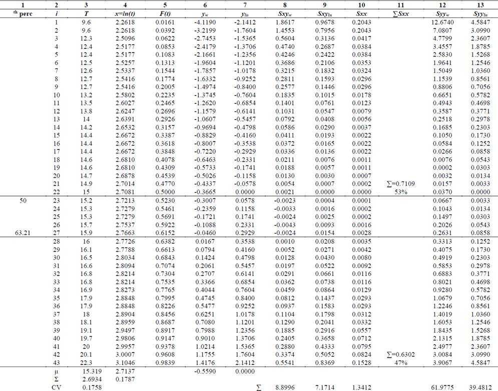 Thus, by using data of Table 4, the lognormal analysis is as follows. From step 1, Sxy ln =7.1714 (column 9). From step 2, Sxx=1.3412 (column 10). From step 3, and eq. (31), b 1ln =5.3471. From step 4, Syy ln =39.4812 (column 13). Therefore, from step 5, and eq. (32), R ln 2 =0.9712.