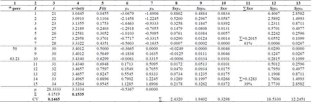 Similarly, by applying the proposed method for the Weibull distribution, we have that, from step 1, Sxy w =2.4320 (column 8). From step 2, Sxx as in the lognormal case, is Sxx=0.3298 (column 10). From step 3, and eq. (31), b 1w =7.3730. And from step 4, Syy w =18.5330 (column 12). Therefore, from step 5, and eq. (32), R w 2 =0.9675.