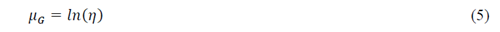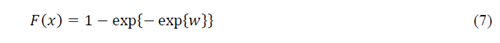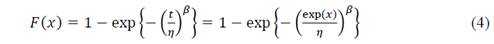 and by taking W=((x-µG)/σG) , eq. (4) is given by F(x) = 1-exp{-exp{(x-ln(η))·β}} which in terms of W is