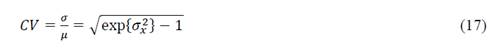 In order to select the lognormal distribution as the best model to represent the data, the following characteristics have to be met. First, the coefficient of variation has to be equal to the log-standard deviation σx ( σx=CV ). Thus, because based on the mean and on the standard deviation of the observed data defined as