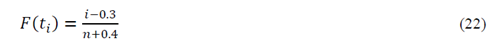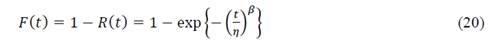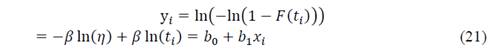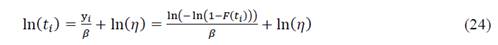Additionally, it is necessary to note that in eq. (21)y=ln(-ln(1-F(t))) represents the behavior of the Gumbel distribution (negative skew), and that once the Weibull parameters β and η are known, the expected data can be estimated as