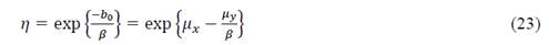 From eq. (21), the shape parameter β is directly given by the slope b1 , and the scale parameter η is given by