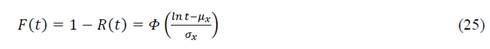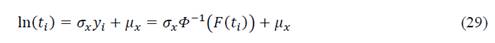 From eq. (26) y=Φ-1(F(t)) represents the behavior of the Normal distribution (symmetrical behavior). Thus, once the lognormal parameters µx and σx are known, the expected data can be estimated from eq.(26) as follows: