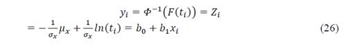 where µx is given by µx=-b0/b1 , and σx is given by σx=1/b1 and F(ti) is estimated as in eq. (22). On the other hand, µx and σx can respectively be estimated directly from the data as