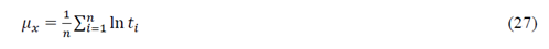By using the Weibull y vector defined in eq. (21) (or the lognormal y vector defined in eq. (26)) and the observed data logarithm (ln(t)=x), the Weibull (or lognormal) correlation is estimated as Sxy=∑yi(xi-µx).