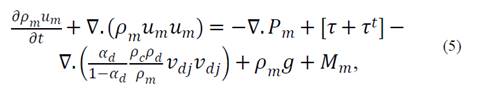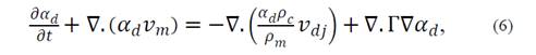 Where, αd represents the dispersed phase volume fraction. Pm , ρm , and um account for the average flow properties and vdj for the dispersion phase drift velocity. Finally, Γ is the diffusion coefficient composed by the molecular and turbulent viscosity.