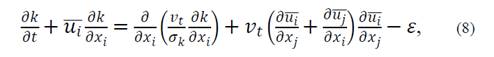 The semi-empirical k-equation and ε-equation are expressed as follows: