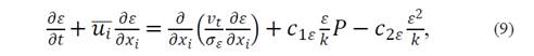 where, P is the generation term of the turbulent kinetic energy, and c1ε , c2ε , σε , cμ are empirical constants.