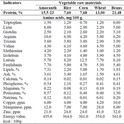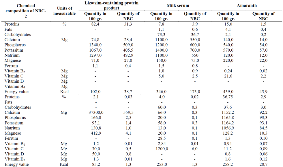 There was conducted the analysis of plants (Table 1) with a purpose to obtain protein-vitamin complex (proteins, polysaccharides, flavonoids, amarantina etc.), from the amaranth leaves and then introducing it into the NBC.