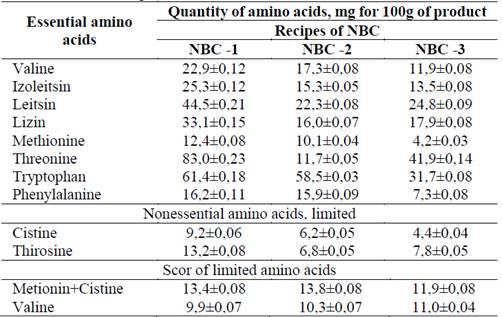 Analyzing the data of the table it can be concluded that the NBC proteins contain a complete set of essential amino acids, which is quick for limiting amino acids is at least 82%.