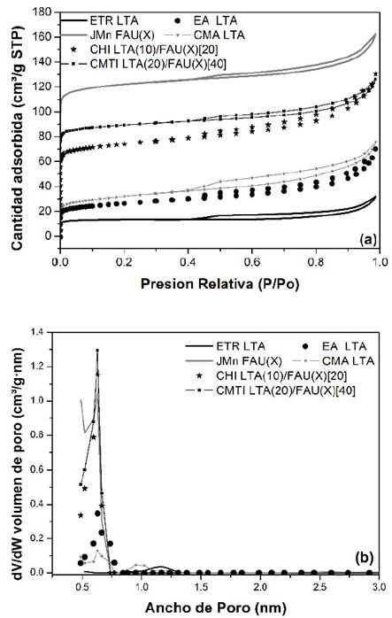 No obstante y a pesar de que las isotermas de adsorción-desorción presentadas por los todos los sólidos son del mismo tipo, la cantidad de volumen adsorbida por cada zeolita es diferente, e incrementa cuando la fase cristalina mayoritaria es del tipo FAU. Dicha característica es más evidente cuando se grafica la distribución de tamaño de poro (DFT) mostrado en la Fig. 7-b, en donde se observa un incremento en la formación de microporos alrededor de 0.6 nm para las zeolitas JMn FAU(X), CHI LTA(10)/FAU(X)[20] y CMTI LTA(20)/FAU(X)[40] comparado con las zeolitas ETR LTA, EA LTA y CMA LTA.