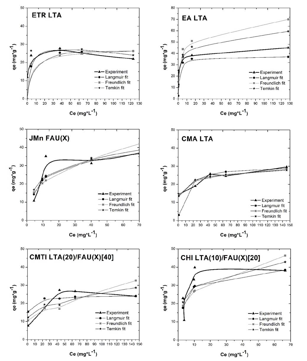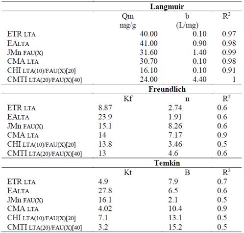 En general y como de esperarse se logra apreciar que los datos experimentales para la remoción de Cr3+ se ajustan mejor al modelo matemático de Langmuir, en donde se observan coeficientes de determinación R2 superiores a 0.97. Este hecho supone que la adsorción del metal sobre las zeolitas sintetizadas se da como un fenómeno de atracción electrostática en donde la energía de adsorción es uniforme.