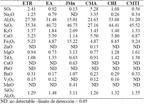 En la caracterización físico química de los residuos industriales se utilizaron en específico dos técnicas convencionales. En la primera de ellas se determinó la composición química mediante fluorescencia de rayos - X, como se muestra en la Tabla 2, permitiendo hallar la relación SiO2/Al2O3 y la presencia de distintos elementos que se encuentran en los residuos. Dicha composición es determinante al momento de seleccionar los residuos que serán usados para la obtención de las zeolitas, puesto que como se ha concluido en diversos estudios la relación SiO2/Al2O3 es uno de los parámetros más importantes en la síntesis [5,11]. Particularmente, una relación SiO2/Al2O3 de 1.2 es el valor apropiado para obtener materiales tipo zeolita de bajo contenido de Si con una alta capacidad de intercambio iónico.