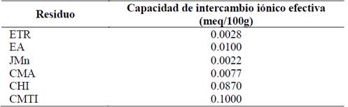Adicionalmente, se determinó la capacidad de intercambio iónico efectiva de estos residuos. Como era de esperarse la capacidad de intercambio iónica de estos residuos se encuentra muy por debajo de los valores encontrados para otras fases minerales y zeolitas con alta capacidad de intercambio (caolinita, 3-15 meq/100g; vermiculita 100-150 meq/100g, bentonita, 100 meq/100g, faujasita, 390 meq/100g, mordenita 230 meq/100g) [10] como se muestra en la Tabla 3.
