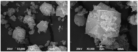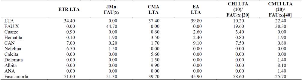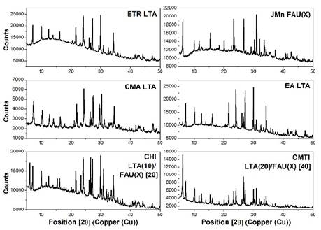 Por otra parte, el tamaño de partícula de las zeolitas sintéticas determinada en las micrografías correspondió a los siguientes valores: 6 µm para ETR LTA, 1 µm para EA LTA, 3 µm para JMn FAU(X), 4 µm para CMA LTA, 1.5 µm para CHI LTA(10)/FAU(X)[20], y 2 µm para CMTI LTA(20)/FAU(X)[40]. Además de ello, también se pudo identificar pequeñas trazas de cenosferas de alrededor de 1 µm. Finalmente estas características descritas anteriormente corresponden a los patrones morfológicos de las fases halladas por difracción de rayos - X.