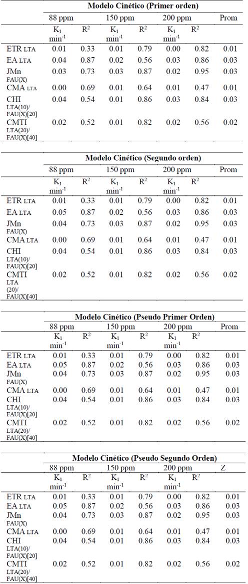Particularmente se evidencio que las zeolitas ETR LTA y EA LTA son los materiales que muestran un mayor desempeño en el proceso de remoción de cromo. Este hecho se evidencia por la alta capacidad de adsorción (Qm) determinada en el modelo de Langmuir con valores de 40 y 41 mg/g respectivamente. De igual forma como lo demuestra la constante de velocidad de adsorción en el modelo de pseudo segundo orden los porcentajes de remoción del metal disminuyen debido a la saturación superficial de la zeolita.