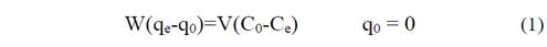 Donde q0 y qe son las concentraciones iniciales y en el equilibrio del adsorbente respectivamente, y C0 y Ce las concentraciones iniciales y en el equilibrio de la solución respectivamente.
