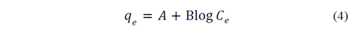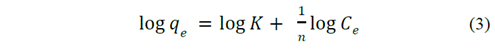 El segundo modelo o modelo de Freundlich representado en la eq. 3, describe la adsorción como un proceso de fisisorción multicapa bajo la cual la adsorción varía exponencialmente debido al recubrimiento superficial sobre el adsorbente.