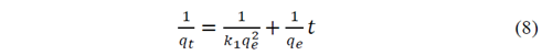Y finalmente el modelo de segundo pseudo-orden o de Ho&Mckay, representado en la eq. 8, está basado en la quimisorción entre el adsorbato-adsorbente.